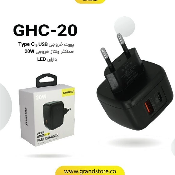 کله شارژر 20 وات USB+PS گرند مدل GHC20